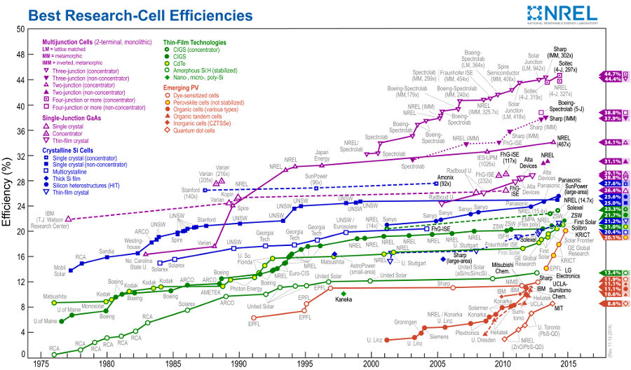 There are often reports about breakthroughs in alternative technologies and when I look, I can find charts claiming that in 2014/2015 top solar conversion efficiency is reported to be at about 45%. However, when I look harder I don't seem to find obtainable Panels above 21%. The highest grade I could get were the Mobile Technology MT-ST110 panels on the odyssey. I can't help but to ask myself: