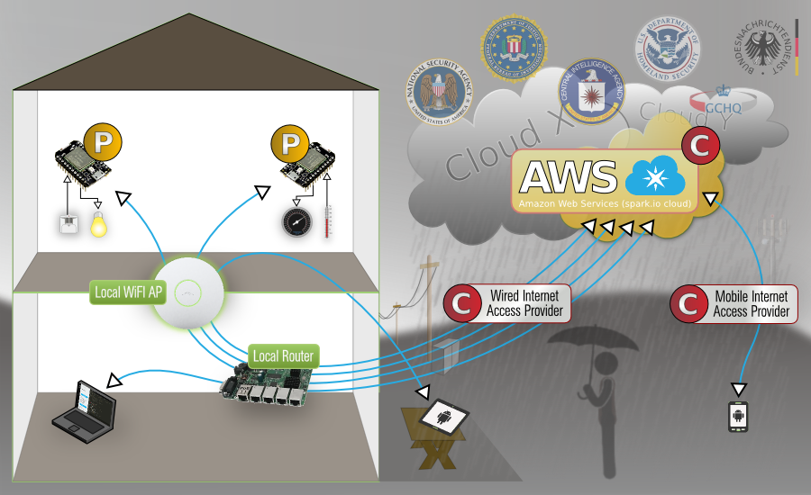 In this picture the blue lines represent the data flow of the Cores, the clients and the central server. All points marked with a red C show where the current implementation/infrastructure is to be considered compromised and the yellow P marks potential security risks (since the firmware isn't compiled locally), theoretically anything can be injected into the firmware, either in the AWS cloud or even in-stream. Tests showed that the API webservers don't offer perfect forward secrecy, the cores itself use only 128-CBC without DH support, which offers no forward secrecy at all. Not having reliable crypto and passing everything through compromised infrastructure can't be the way to go. Not to mention, the additional amount of required bandwidth this concept ultimately creates, when you consider the available IPv6 address space and a fair likelihood, that not so far off, there will be more IoT clients connected to the Internet, than there are humans.