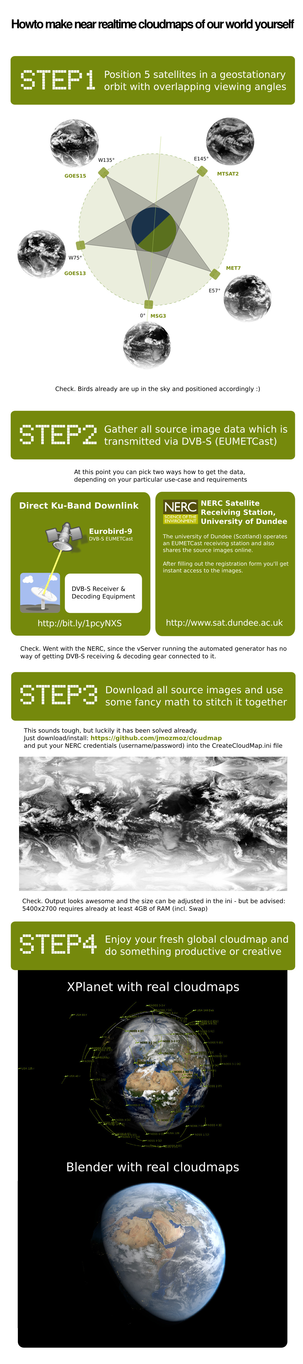 After playing a bit more with xplanet again for a couple of days in order to get realtime satellite positions directly on the desktop (see xfce-planet) I got frustrated by the cloud layer again. There was a time when some people put up mirrors of the near current (3-6 hours) global cloudmap we could use as a source for xplanet, but now it seems to have been split into some paid subscription model for high resolution and the low resolution image is distributed via CoralCDN, which, although I like the concept, failed constantly in delivering the global cloudmap.